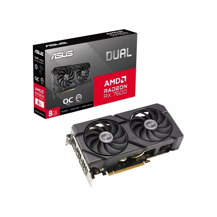 ASUS Radeon RX 7600 EVO OC Edition DUAL-RX7600-O8G-EVO 8GB GDDR6 128-Bit PCIe 4.0 Desktop Graphics Card, Game Clock: Up To 2280 MHz, Boost Clock: Up To 2695 MHz, OC Mode: Up to 2715 MHz (Boost Clock), Stream Processors: 2048, AMD RDNA 3 Architecture, Microsoft DirectX Ray Tracing Technology, AMD Radeon AI Accelerators, AMD HYPR-RX Game Optimisation, AMD Fidelity FX Super Resolution Upscaling Technology, AMD Radeon FreeSync Premium VRR Technology, AV1 Decode / Encode Engines, Video Memory: 8GB GDDR6, Infinity Cache: 32MB, Memory Clock: 18Gbps, Memory Bus Width: 128-bit, 3x DisplayPort 2.1, 1x HDMI 2.1 Ports, Multi-Display Capability: 4x Displays, Maximum Digital Resolution: Up to 7680×4320, Axial-Tech Fan Design, Dual Ball Bearing Fans, 0dB Technology, ASUS GPU Tweak III, 3 Year Warranty